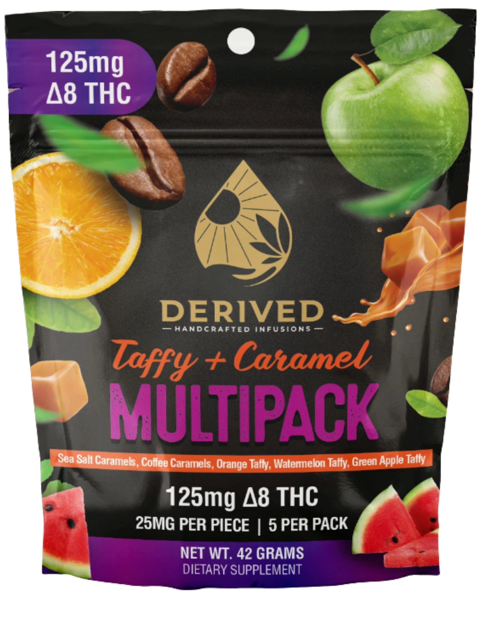 This Multipack holds 5 different recipes in one bag! “Can’t Choose One, Chews Many” is the motto and you are sure to get a well-rounded experience from a wide variety of flavors in this pack. This multipack includes Orange Taffy, Watermelon Taffy, Green Apple Taffy, Sea Salt Caramels (High Times Award Winning), and Coffee Caramels!